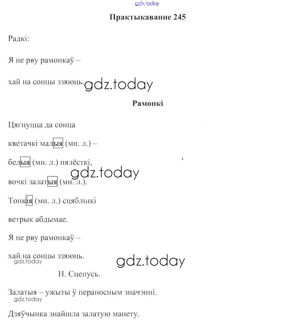 На страницах сайта gdz.today вы найдете учебный и вспомогательный материал, направленный на улучшения знаний школьной программы. ГДЗ - онлайн мир знаний Рашальнік да часткі 2. Практыкаванні 245 Учебнику по Белорусскому языку для 3 класса Свірыдзенка Национальный институт образования 2017