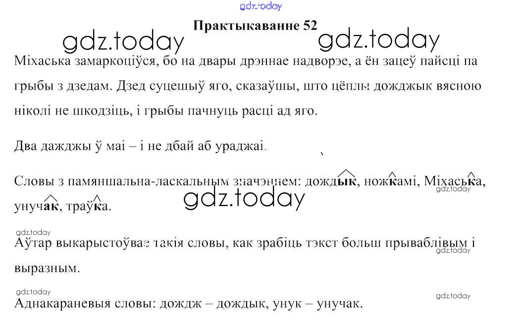 На страницах сайта gdz.today вы найдете учебный и вспомогательный материал, направленный на улучшения знаний школьной программы. ГДЗ - онлайн мир знаний Рашальнік да часткі 2. Практыкаванні 52 Учебнику по Белорусскому языку для 3 класса Свірыдзенка Национальный институт образования 2017
