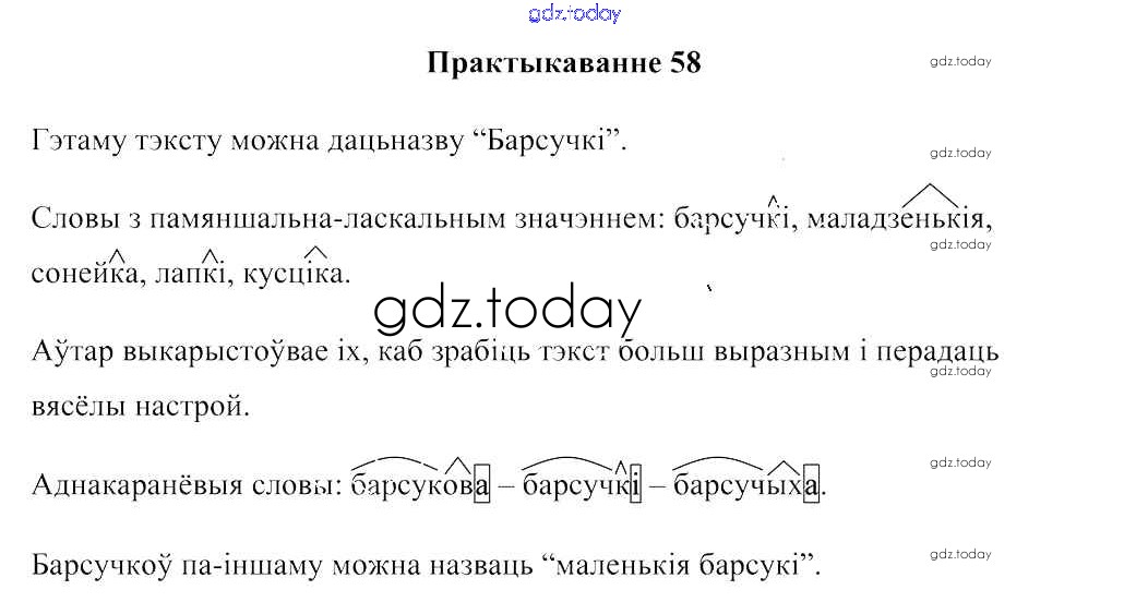 На страницах сайта gdz.today вы найдете учебный и вспомогательный материал, направленный на улучшения знаний школьной программы. ГДЗ - онлайн мир знаний Рашальнік да часткі 2. Практыкаванні 58 Учебнику по Белорусскому языку для 3 класса Свірыдзенка Национальный институт образования 2017