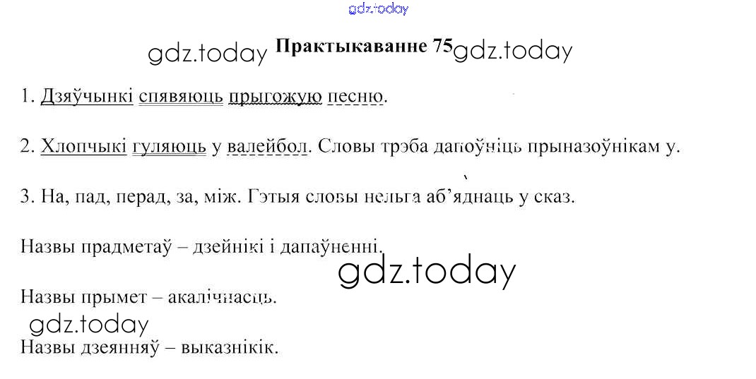 На страницах сайта gdz.today вы найдете учебный и вспомогательный материал, направленный на улучшения знаний школьной программы. ГДЗ - онлайн мир знаний Рашальнік да часткі 2. Практыкаванні 75 Учебнику по Белорусскому языку для 3 класса Свірыдзенка Национальный институт образования 2017