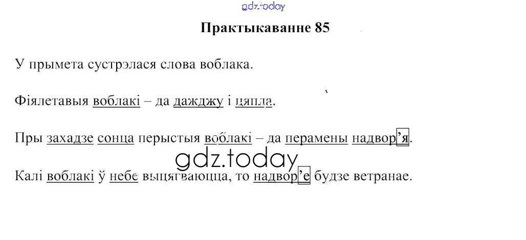 На страницах сайта gdz.today вы найдете учебный и вспомогательный материал, направленный на улучшения знаний школьной программы. ГДЗ - онлайн мир знаний Рашальнік да часткі 2. Практыкаванні 85 Учебнику по Белорусскому языку для 3 класса Свірыдзенка Национальный институт образования 2017