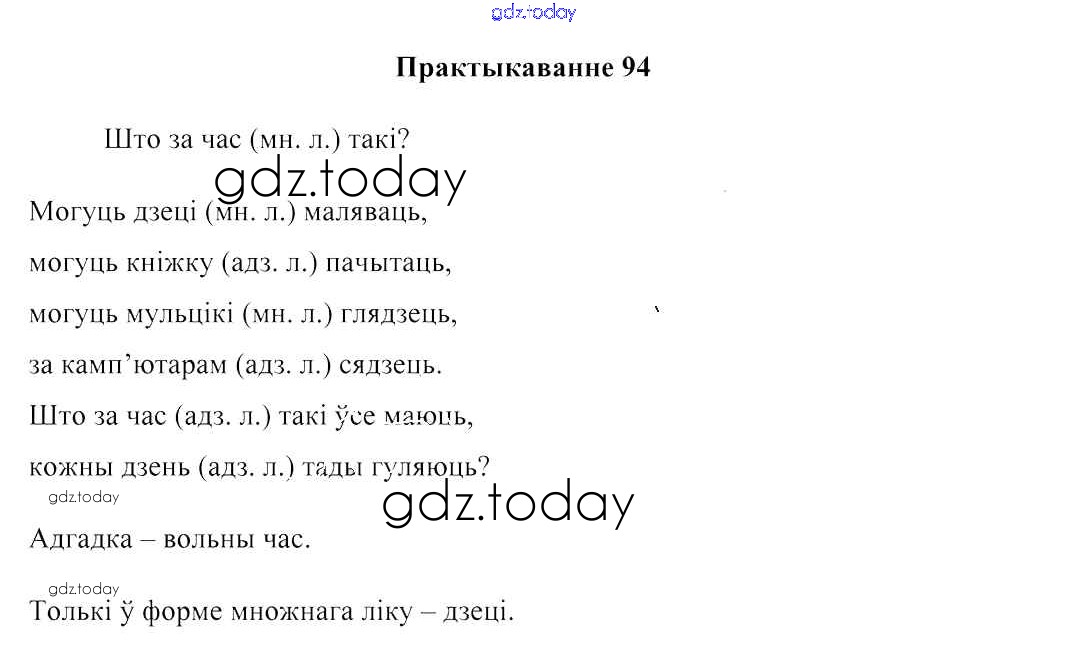 На страницах сайта gdz.today вы найдете учебный и вспомогательный материал, направленный на улучшения знаний школьной программы. ГДЗ - онлайн мир знаний Рашальнік да часткі 2. Практыкаванні 94 Учебнику по Белорусскому языку для 3 класса Свірыдзенка Национальный институт образования 2017