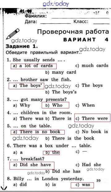 На страницах сайта gdz.today вы найдете учебный и вспомогательный материал, направленный на улучшения знаний школьной программы. ГДЗ - онлайн мир знаний Страницы (решение) 39 Проверочным работам по Английскому языку для 3 класса Барашкова Экзамен УМК 2016
