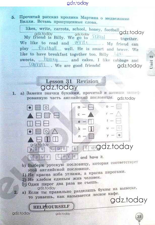 На страницах сайта gdz.today вы найдете учебный и вспомогательный материал, направленный на улучшения знаний школьной программы. ГДЗ - онлайн мир знаний Страницы (решение) 35 Рабочей тетради по Английскому языку для 3 класса Биболетова, Денисенко Титул Enjoy English 2015