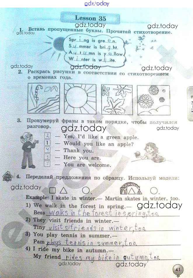 На страницах сайта gdz.today вы найдете учебный и вспомогательный материал, направленный на улучшения знаний школьной программы. ГДЗ - онлайн мир знаний Страницы (решение) 41 Рабочей тетради по Английскому языку для 3 класса Биболетова, Денисенко Титул Enjoy English 2015