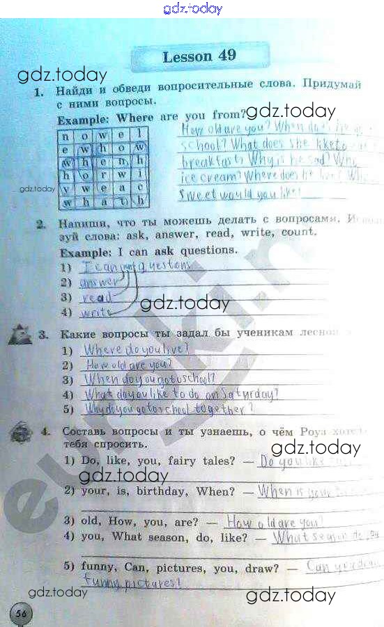 На страницах сайта gdz.today вы найдете учебный и вспомогательный материал, направленный на улучшения знаний школьной программы. ГДЗ - онлайн мир знаний Страницы (решение) 56 Рабочей тетради по Английскому языку для 3 класса Биболетова, Денисенко Титул Enjoy English 2015