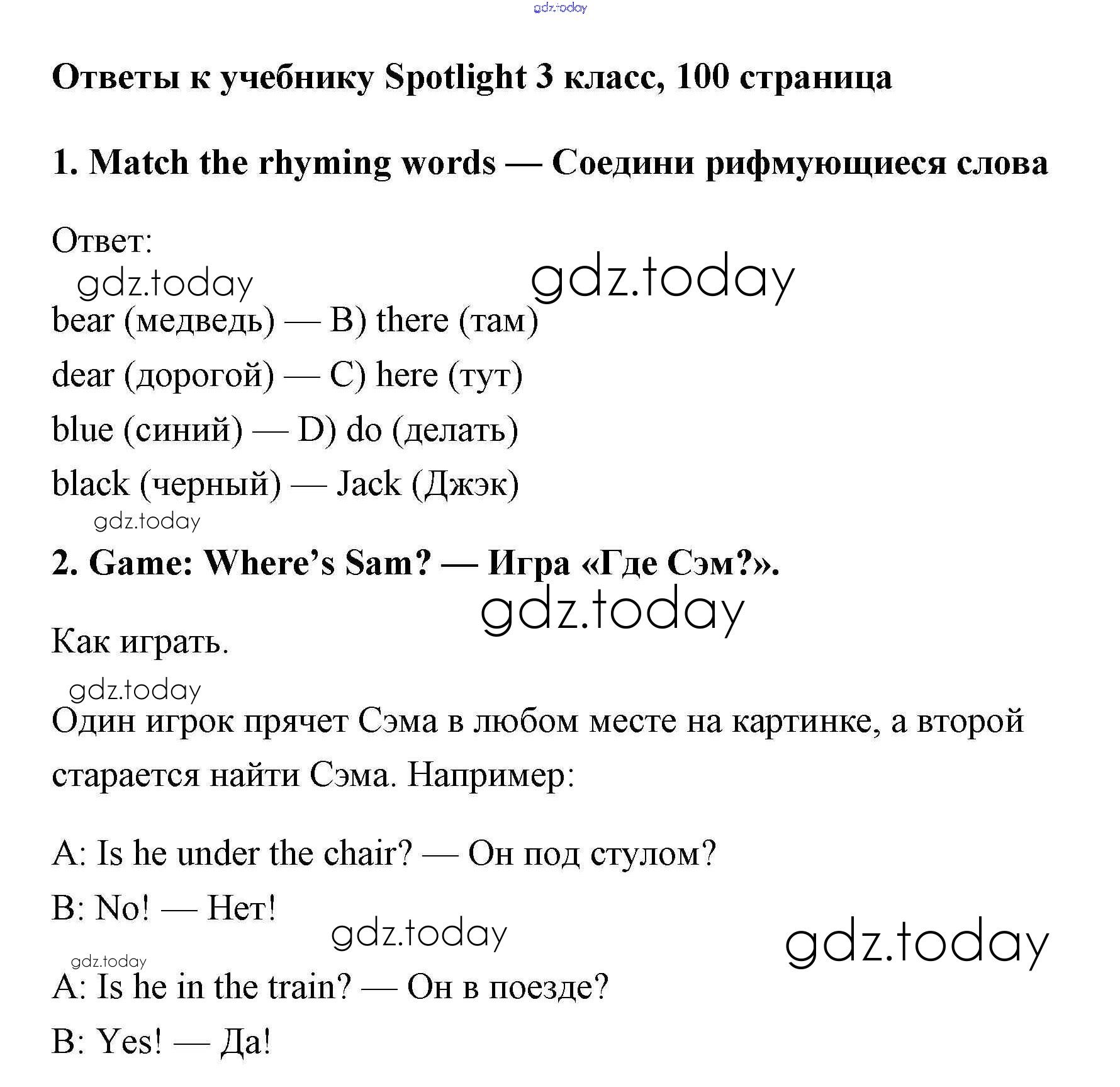 На страницах сайта gdz.today вы найдете учебный и вспомогательный материал, направленный на улучшения знаний школьной программы. ГДЗ - онлайн мир знаний Страницы (решение) 100 Учебнику по Английскому языку для 3 класса Быкова, Эванс Просвещение Spotlight 2015