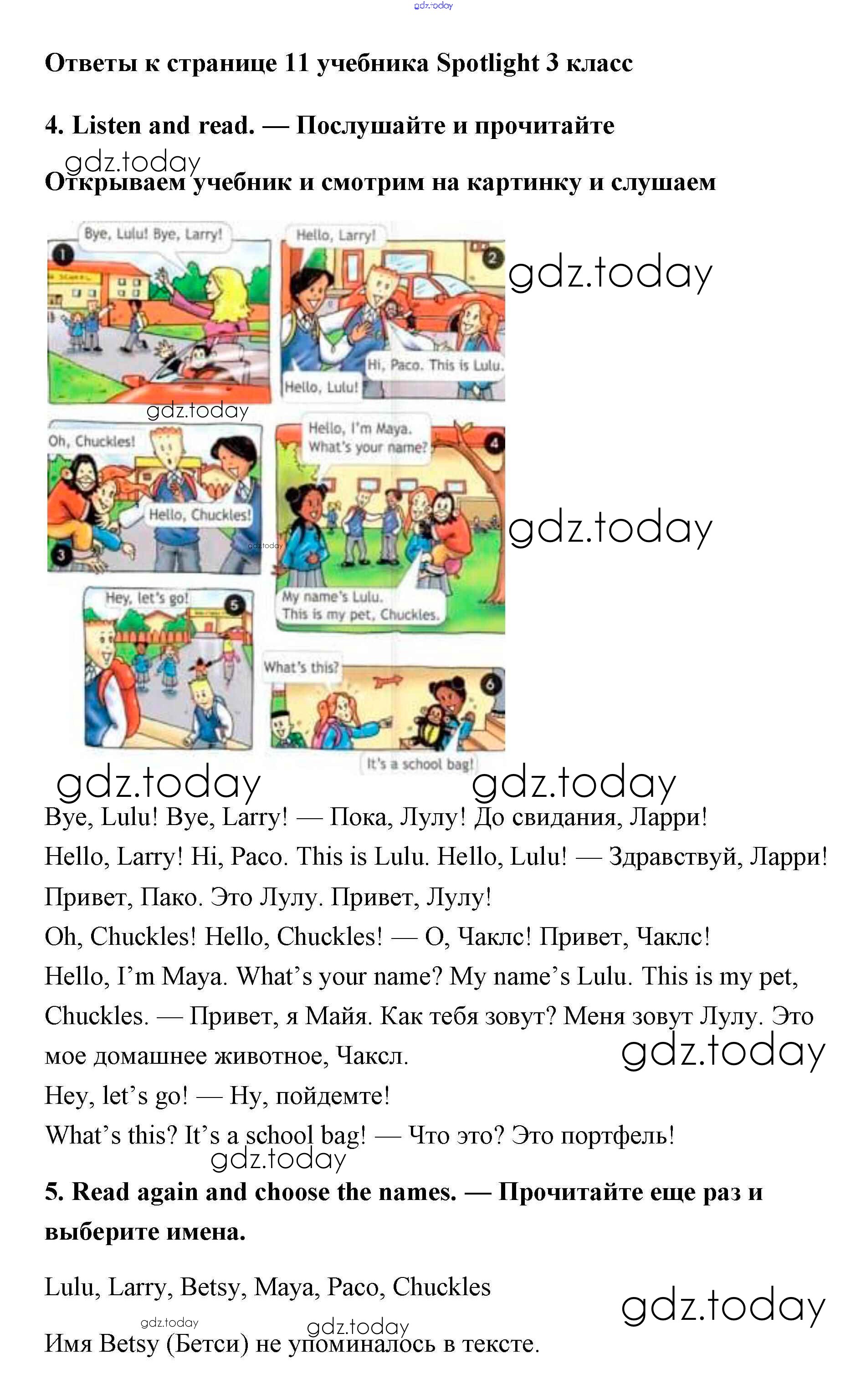 На страницах сайта gdz.today вы найдете учебный и вспомогательный материал, направленный на улучшения знаний школьной программы. ГДЗ - онлайн мир знаний Страницы (решение) 11 Учебнику по Английскому языку для 3 класса Быкова, Эванс Просвещение Spotlight 2015