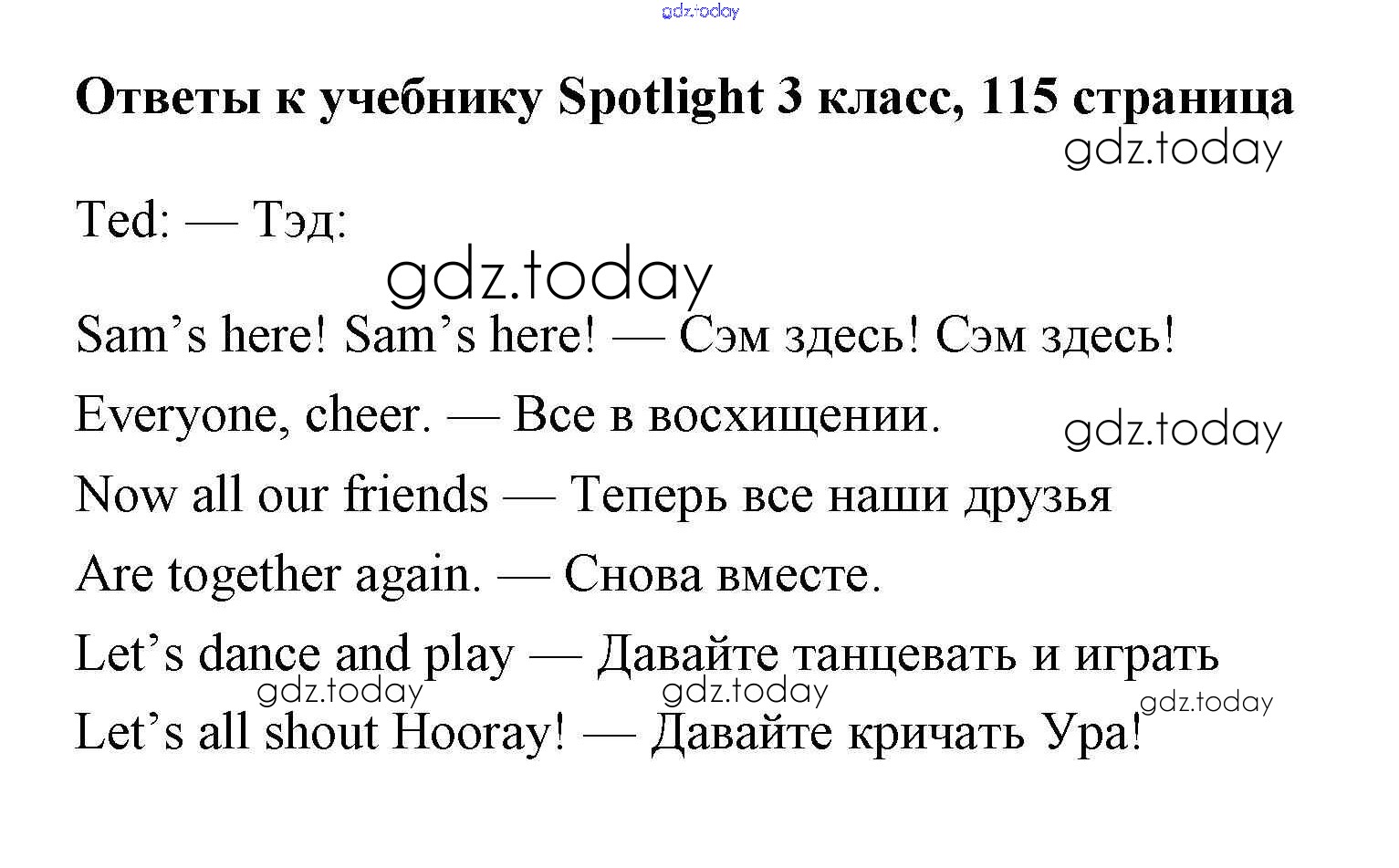 На страницах сайта gdz.today вы найдете учебный и вспомогательный материал, направленный на улучшения знаний школьной программы. ГДЗ - онлайн мир знаний Страницы (решение) 115 Учебнику по Английскому языку для 3 класса Быкова, Эванс Просвещение Spotlight 2015
