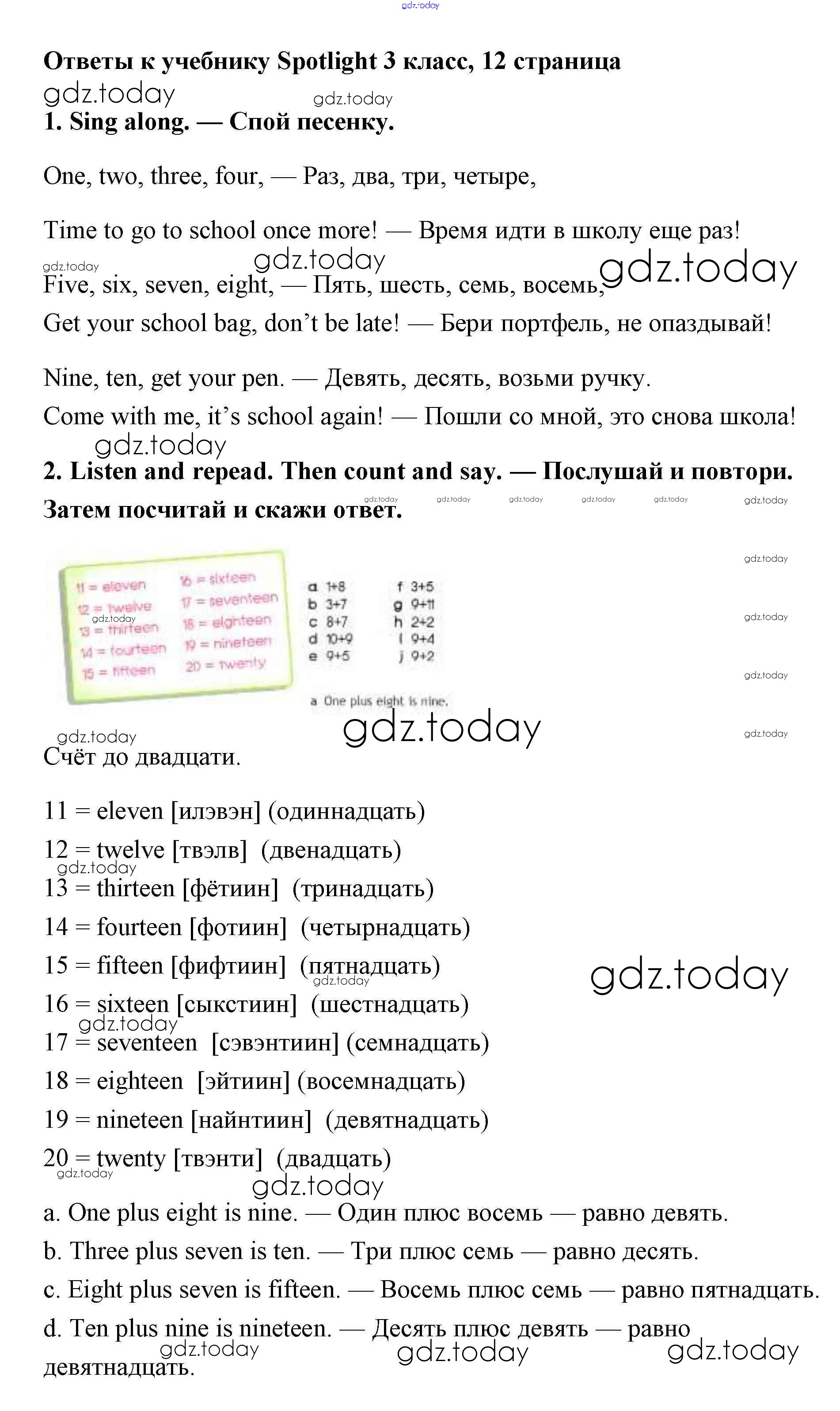 На страницах сайта gdz.today вы найдете учебный и вспомогательный материал, направленный на улучшения знаний школьной программы. ГДЗ - онлайн мир знаний Страницы (решение) 12 Учебнику по Английскому языку для 3 класса Быкова, Эванс Просвещение Spotlight 2015