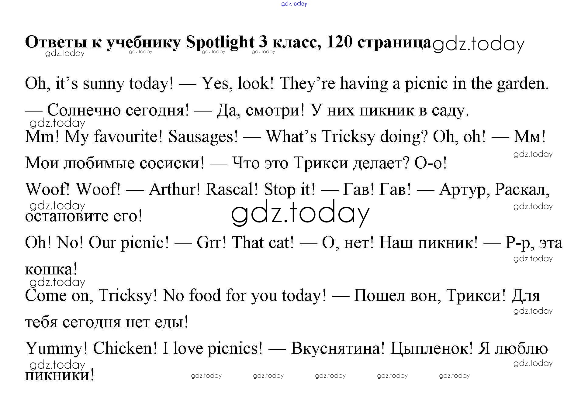 На страницах сайта gdz.today вы найдете учебный и вспомогательный материал, направленный на улучшения знаний школьной программы. ГДЗ - онлайн мир знаний Страницы (решение) 120 Учебнику по Английскому языку для 3 класса Быкова, Эванс Просвещение Spotlight 2015