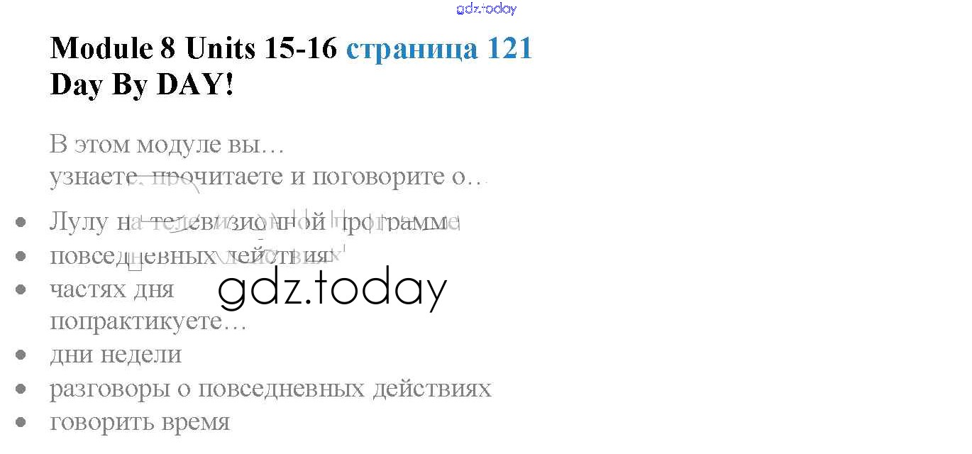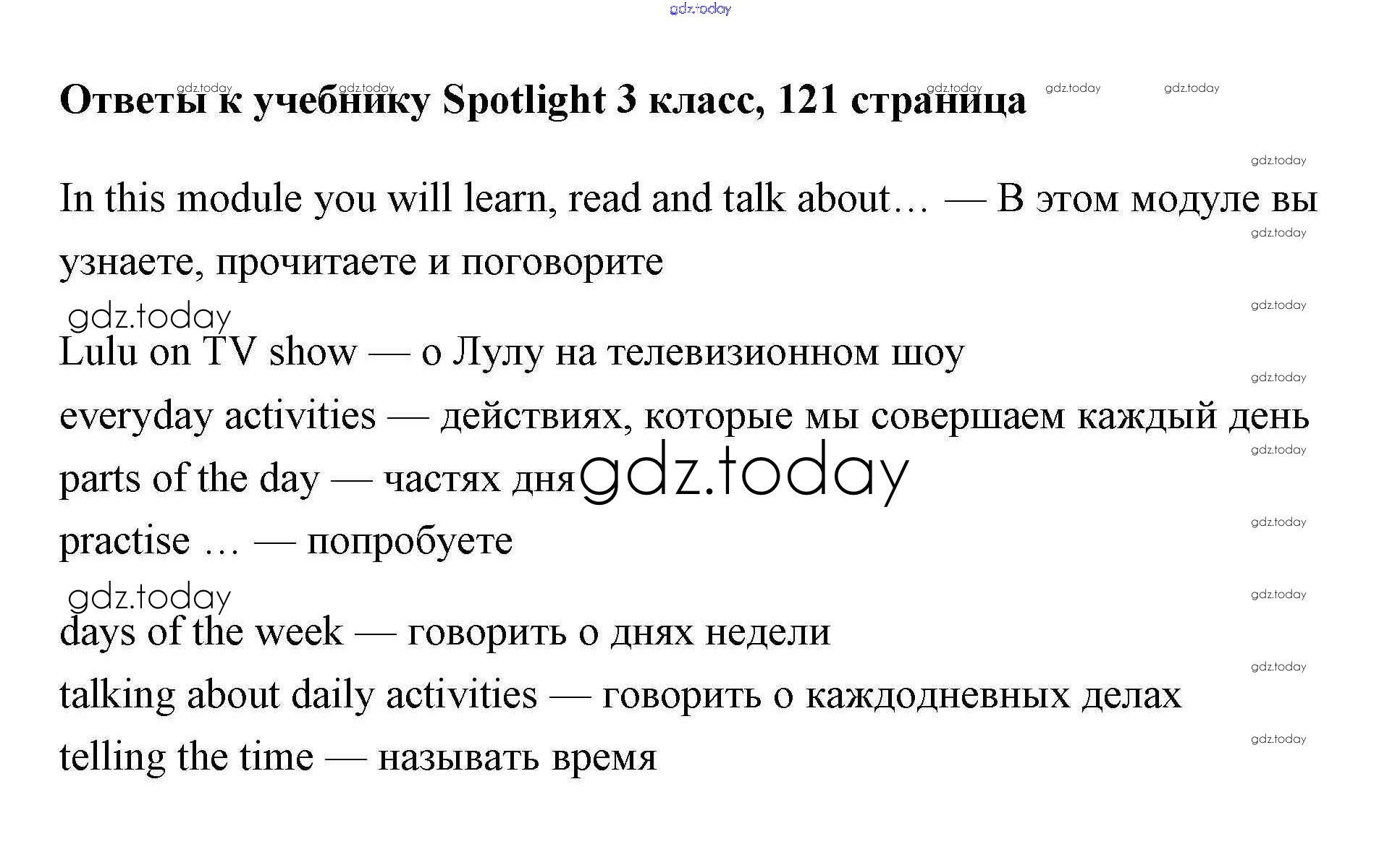 На страницах сайта gdz.today вы найдете учебный и вспомогательный материал, направленный на улучшения знаний школьной программы. ГДЗ - онлайн мир знаний Страницы (решение) 121 Учебнику по Английскому языку для 3 класса Быкова, Эванс Просвещение Spotlight 2015