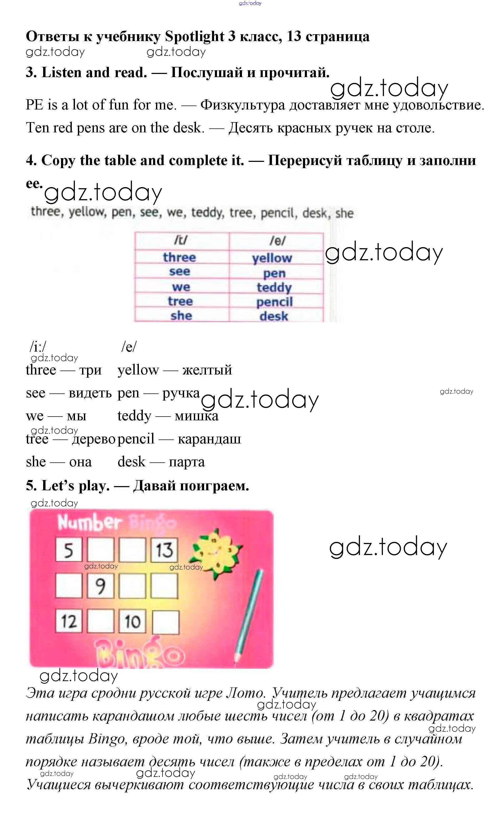 На страницах сайта gdz.today вы найдете учебный и вспомогательный материал, направленный на улучшения знаний школьной программы. ГДЗ - онлайн мир знаний Страницы (решение) 13 Учебнику по Английскому языку для 3 класса Быкова, Эванс Просвещение Spotlight 2015