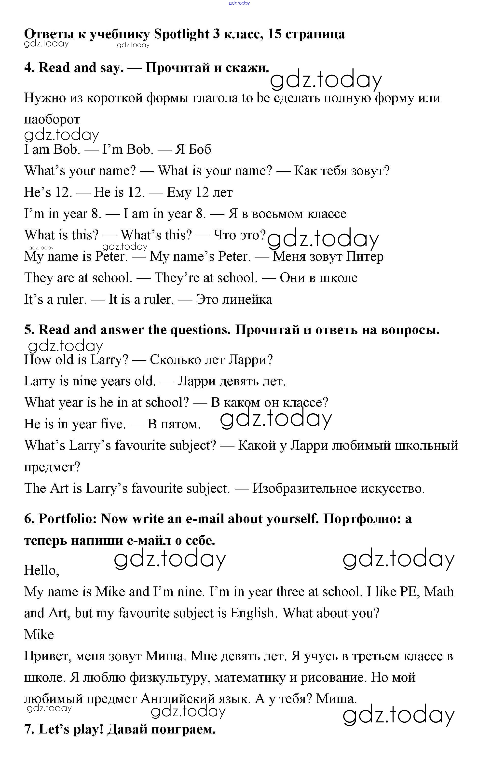 Ответы к Страницы (решение) 15 Учебнику по Английскому языку для 3 класса Быкова, Эванс Просвещение Spotlight 2015