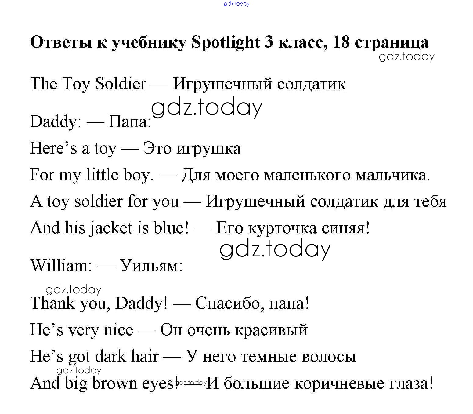 На страницах сайта gdz.today вы найдете учебный и вспомогательный материал, направленный на улучшения знаний школьной программы. ГДЗ - онлайн мир знаний Страницы (решение) 18 Учебнику по Английскому языку для 3 класса Быкова, Эванс Просвещение Spotlight 2015