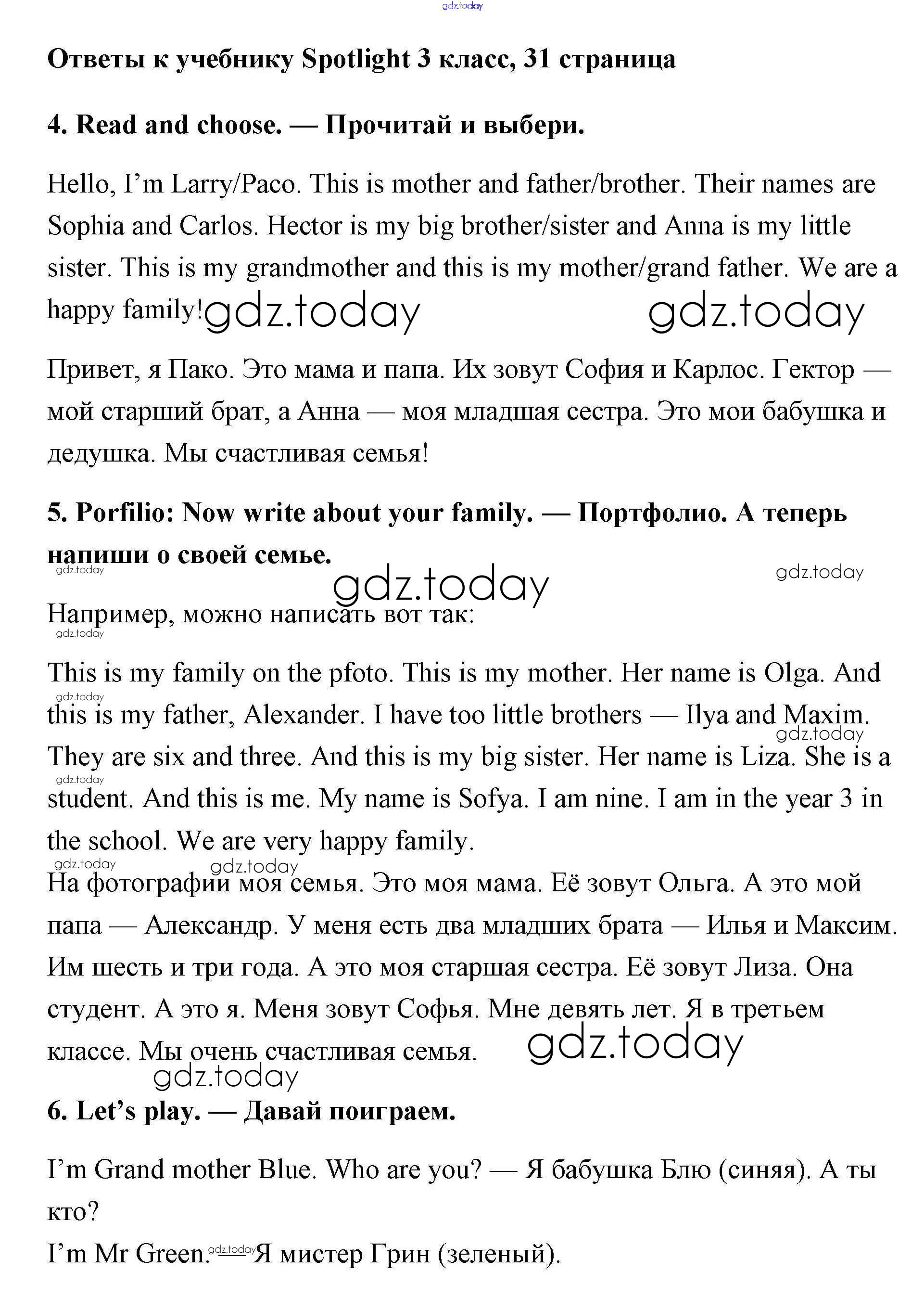 Ответы к Страницы (решение) 31 Учебнику по Английскому языку для 3 класса Быкова, Эванс Просвещение Spotlight 2015