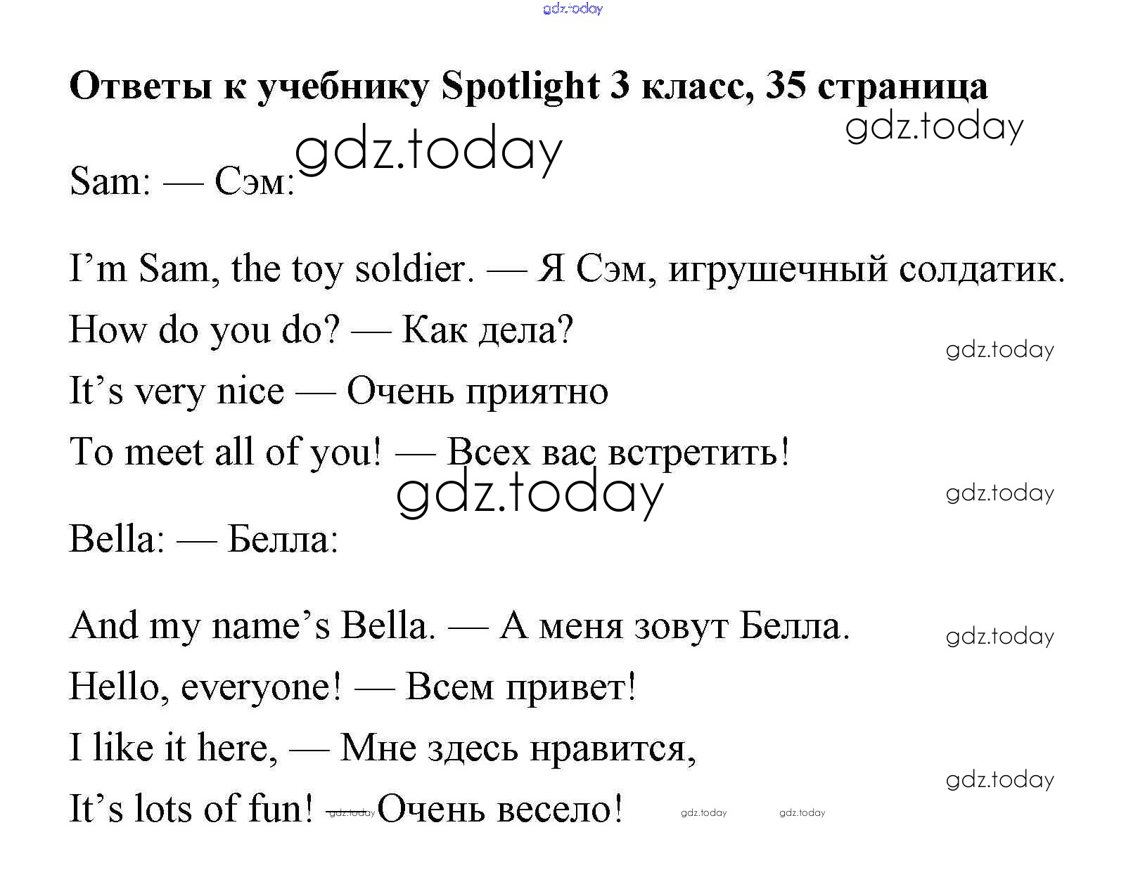 На страницах сайта gdz.today вы найдете учебный и вспомогательный материал, направленный на улучшения знаний школьной программы. ГДЗ - онлайн мир знаний Страницы (решение) 35 Учебнику по Английскому языку для 3 класса Быкова, Эванс Просвещение Spotlight 2015