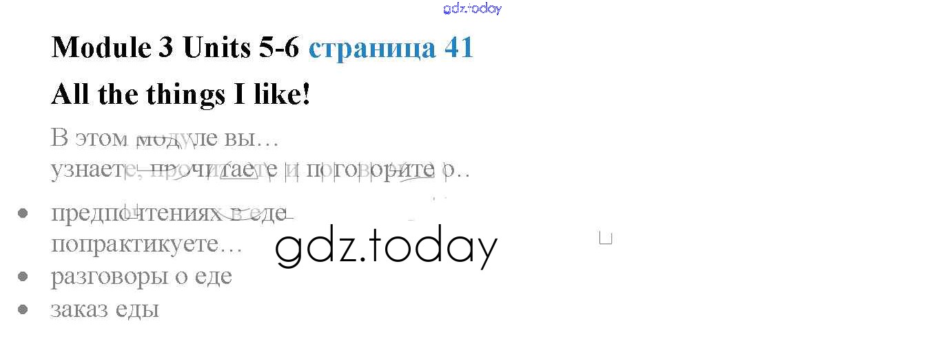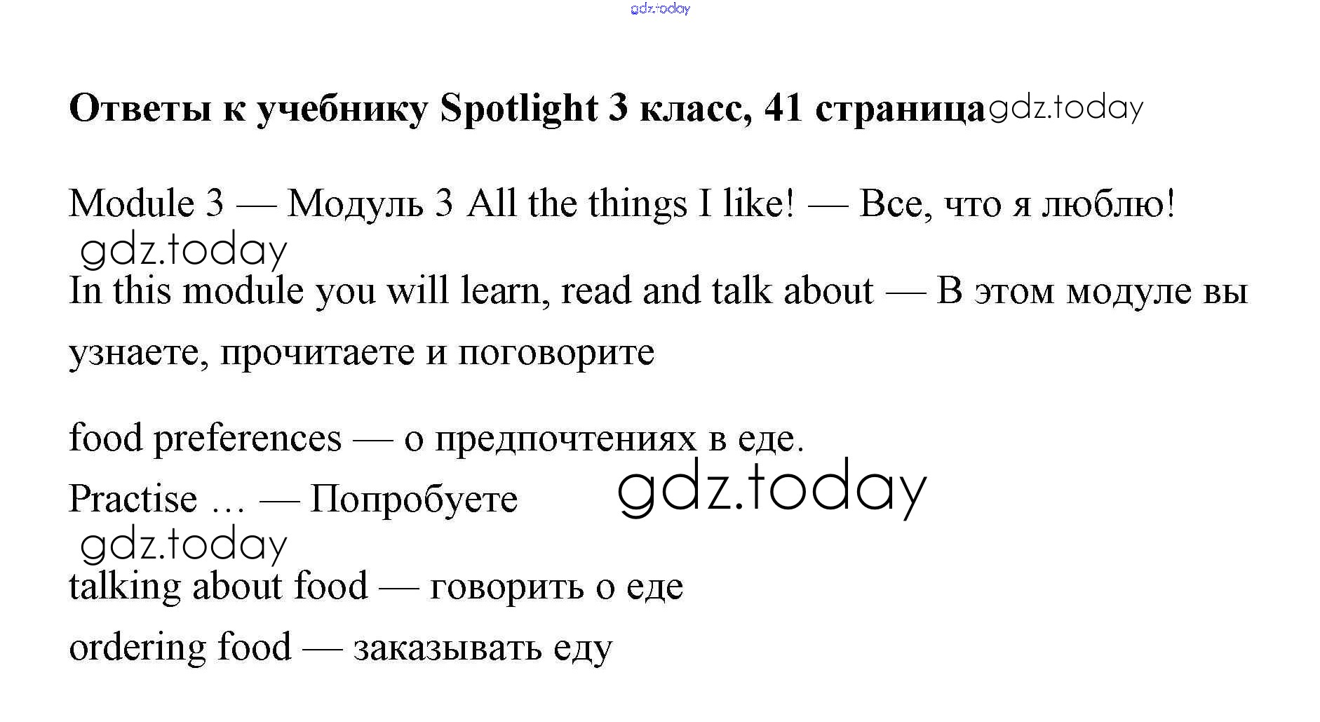 На страницах сайта gdz.today вы найдете учебный и вспомогательный материал, направленный на улучшения знаний школьной программы. ГДЗ - онлайн мир знаний Страницы (решение) 41 Учебнику по Английскому языку для 3 класса Быкова, Эванс Просвещение Spotlight 2015