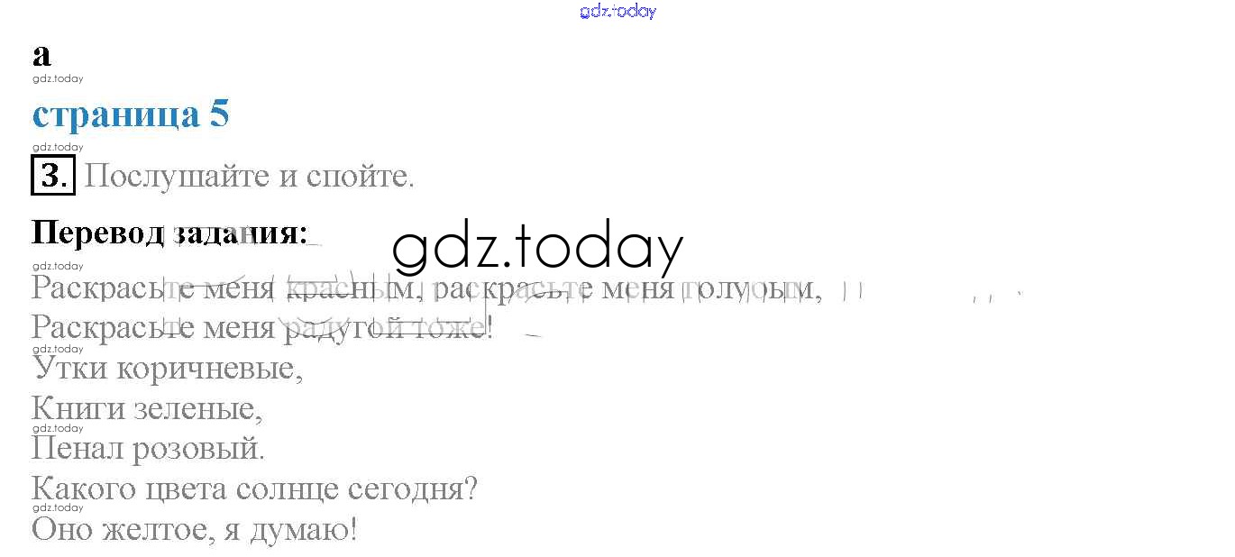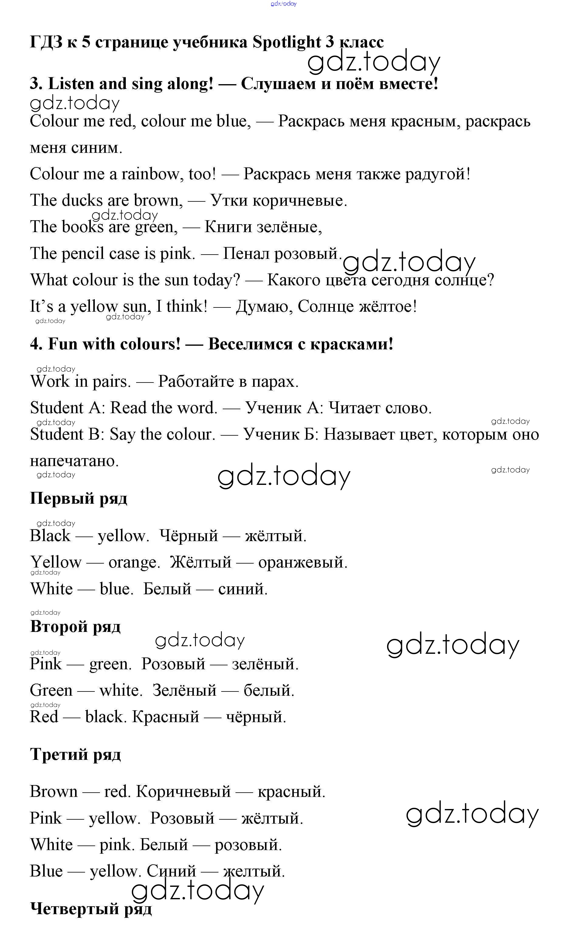 На страницах сайта gdz.today вы найдете учебный и вспомогательный материал, направленный на улучшения знаний школьной программы. ГДЗ - онлайн мир знаний Страницы (решение) 5 Учебнику по Английскому языку для 3 класса Быкова, Эванс Просвещение Spotlight 2015