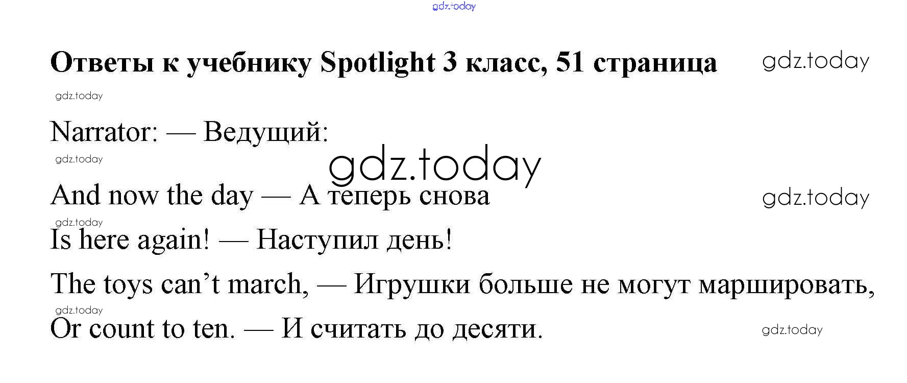 На страницах сайта gdz.today вы найдете учебный и вспомогательный материал, направленный на улучшения знаний школьной программы. ГДЗ - онлайн мир знаний Страницы (решение) 51 Учебнику по Английскому языку для 3 класса Быкова, Эванс Просвещение Spotlight 2015