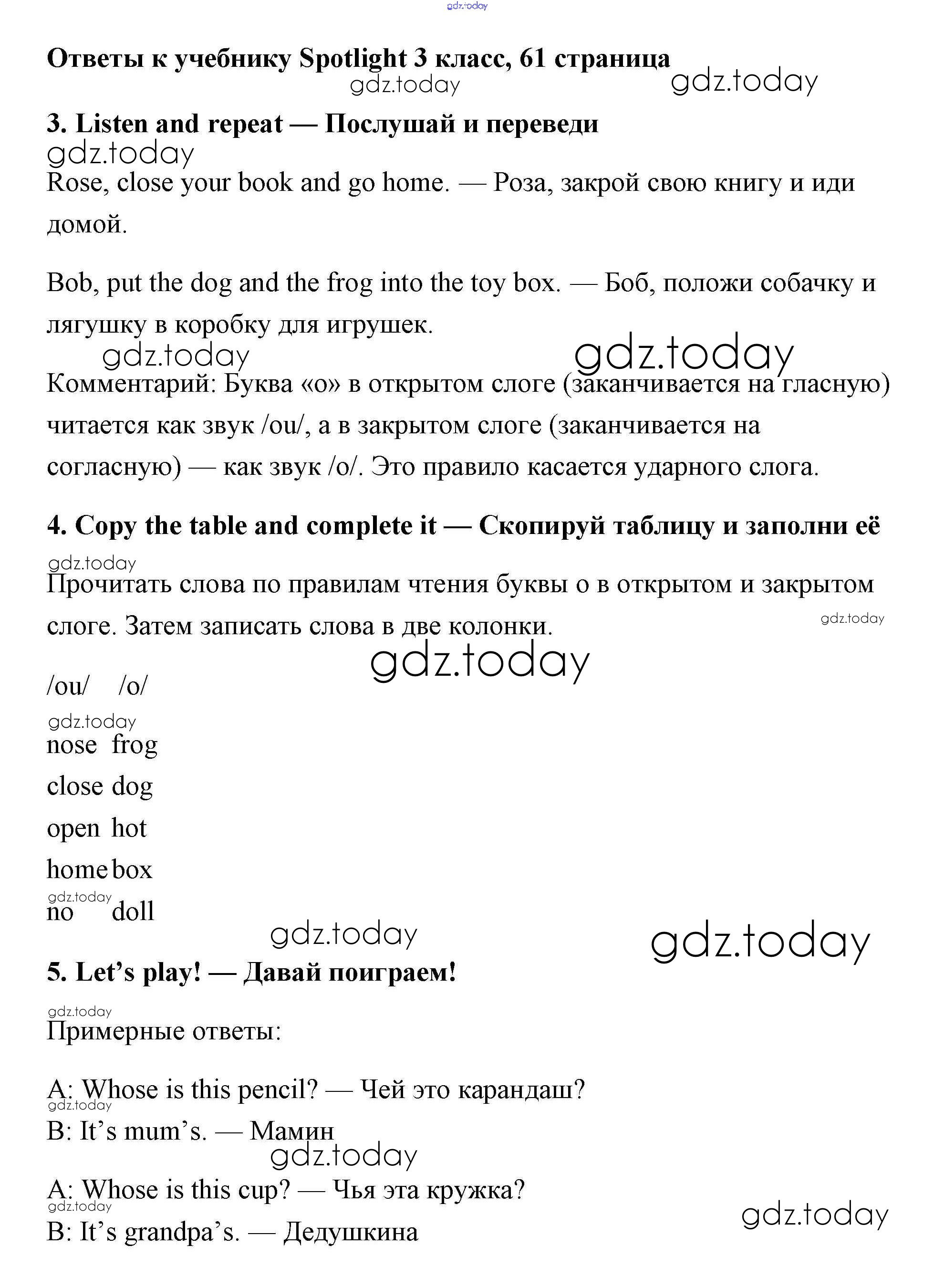 Ответы к Страницы (решение) 61 Учебнику по Английскому языку для 3 класса Быкова, Эванс Просвещение Spotlight 2015