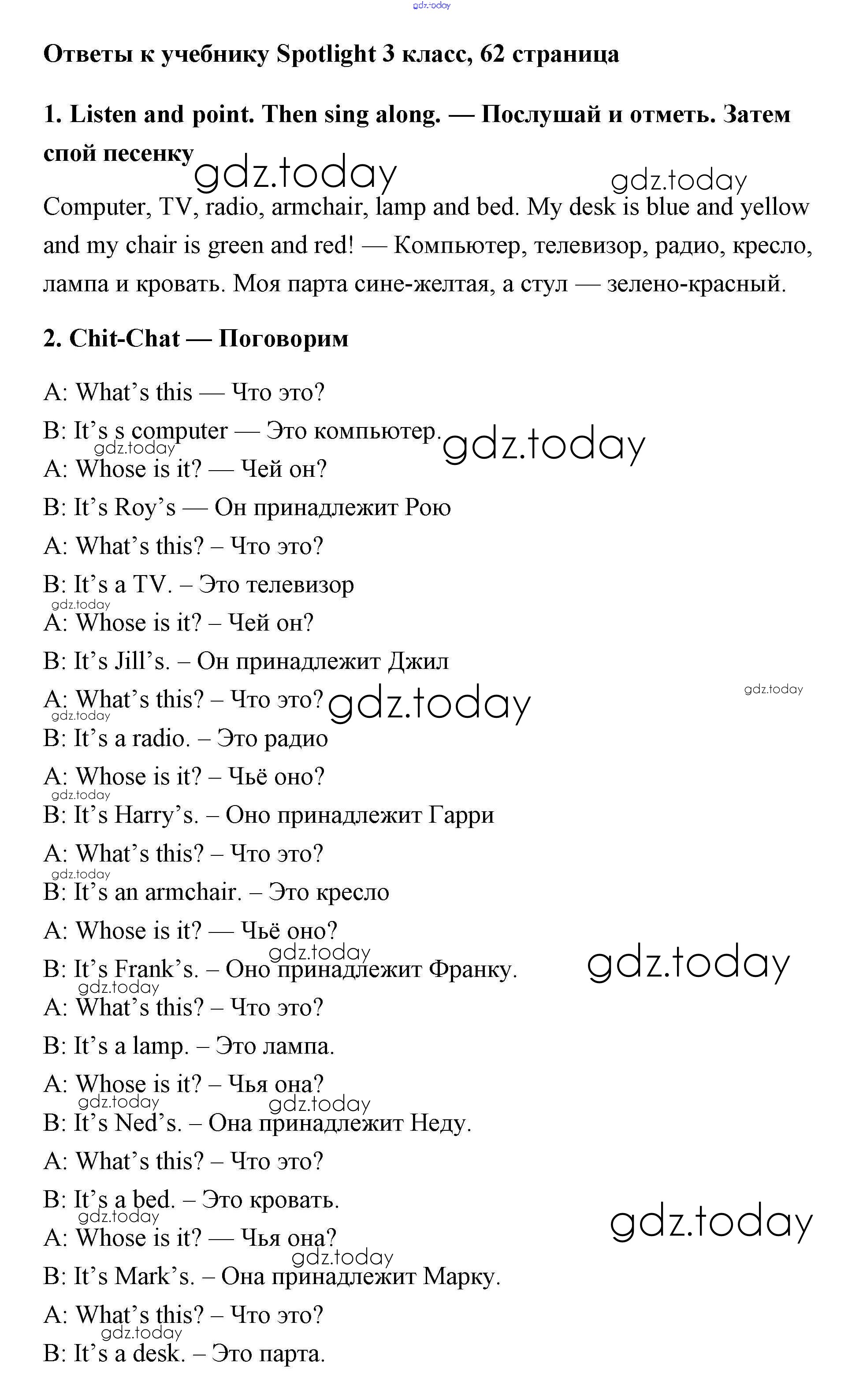 Ответы к Страницы (решение) 62 Учебнику по Английскому языку для 3 класса Быкова, Эванс Просвещение Spotlight 2015