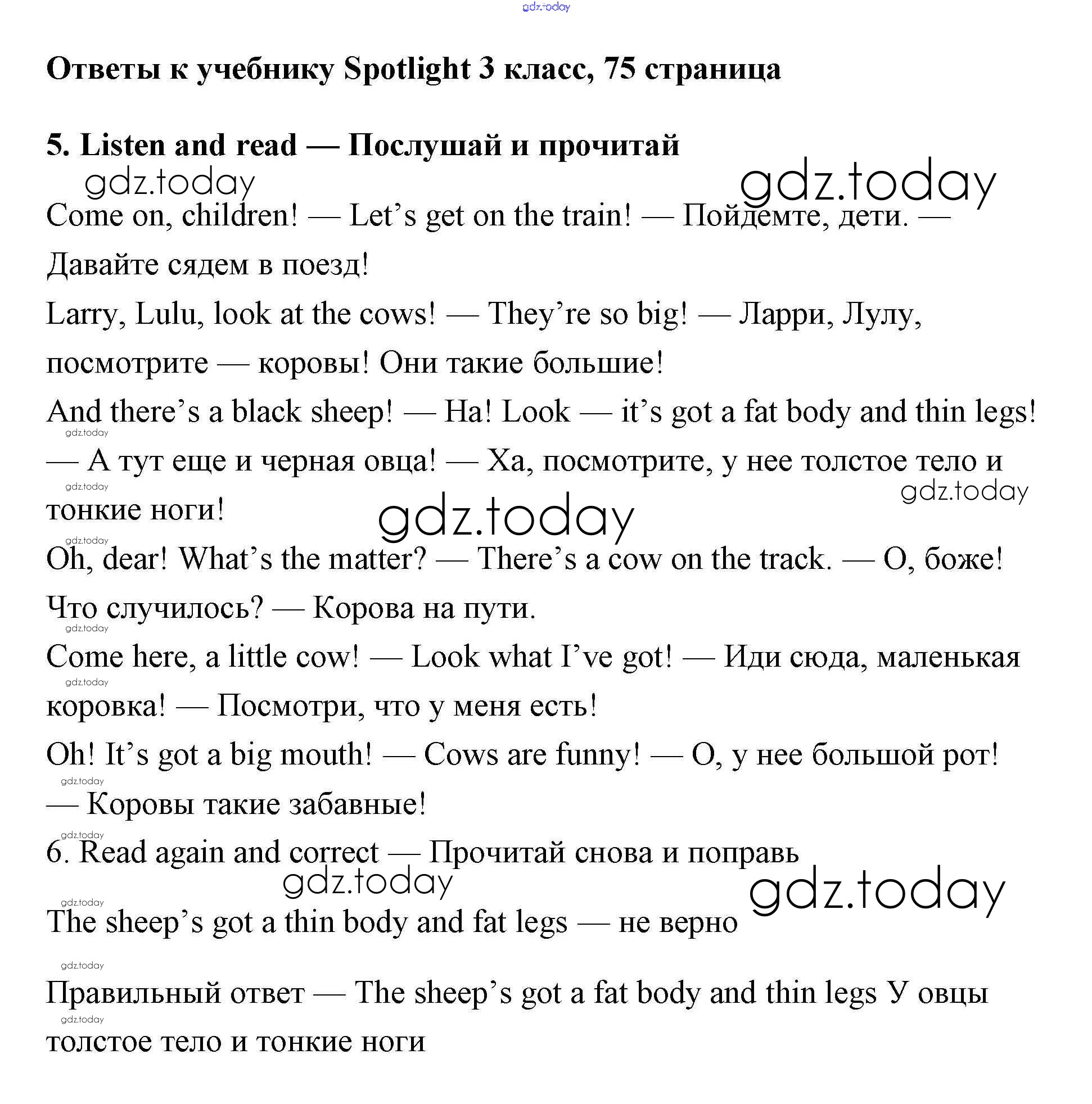 На страницах сайта gdz.today вы найдете учебный и вспомогательный материал, направленный на улучшения знаний школьной программы. ГДЗ - онлайн мир знаний Страницы (решение) 75 Учебнику по Английскому языку для 3 класса Быкова, Эванс Просвещение Spotlight 2015