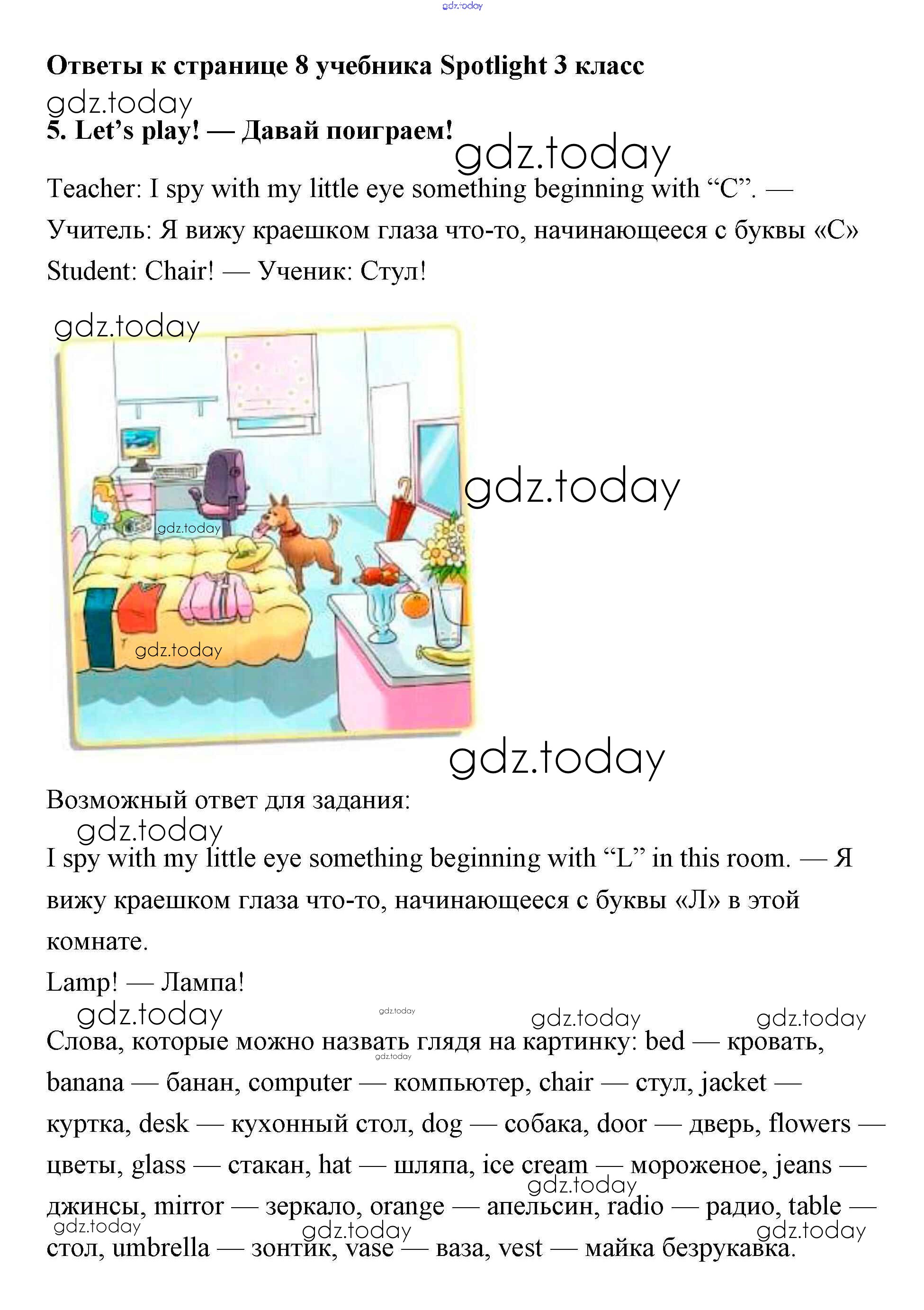 На страницах сайта gdz.today вы найдете учебный и вспомогательный материал, направленный на улучшения знаний школьной программы. ГДЗ - онлайн мир знаний Страницы (решение) 8 Учебнику по Английскому языку для 3 класса Быкова, Эванс Просвещение Spotlight 2015