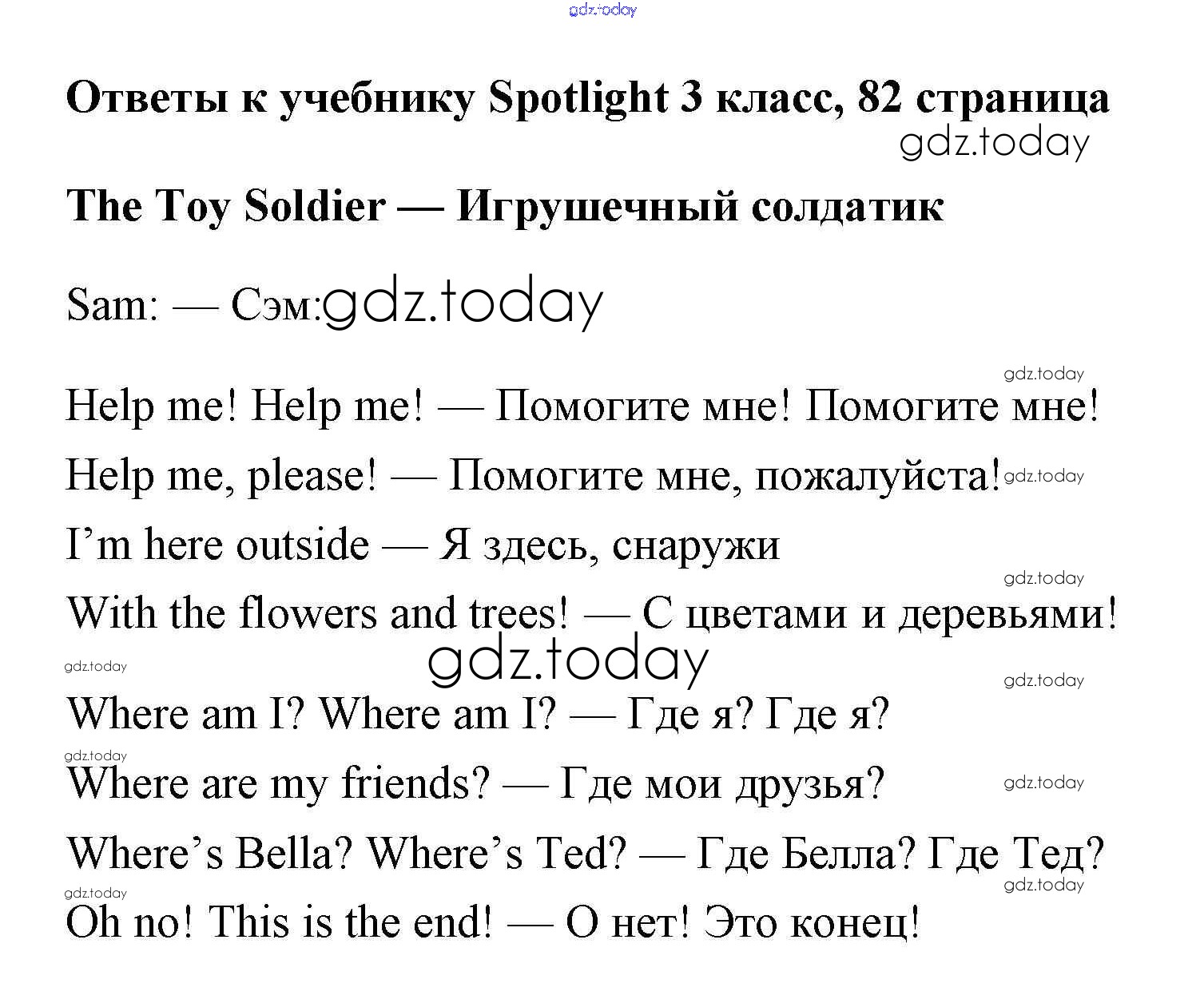 На страницах сайта gdz.today вы найдете учебный и вспомогательный материал, направленный на улучшения знаний школьной программы. ГДЗ - онлайн мир знаний Страницы (решение) 82 Учебнику по Английскому языку для 3 класса Быкова, Эванс Просвещение Spotlight 2015
