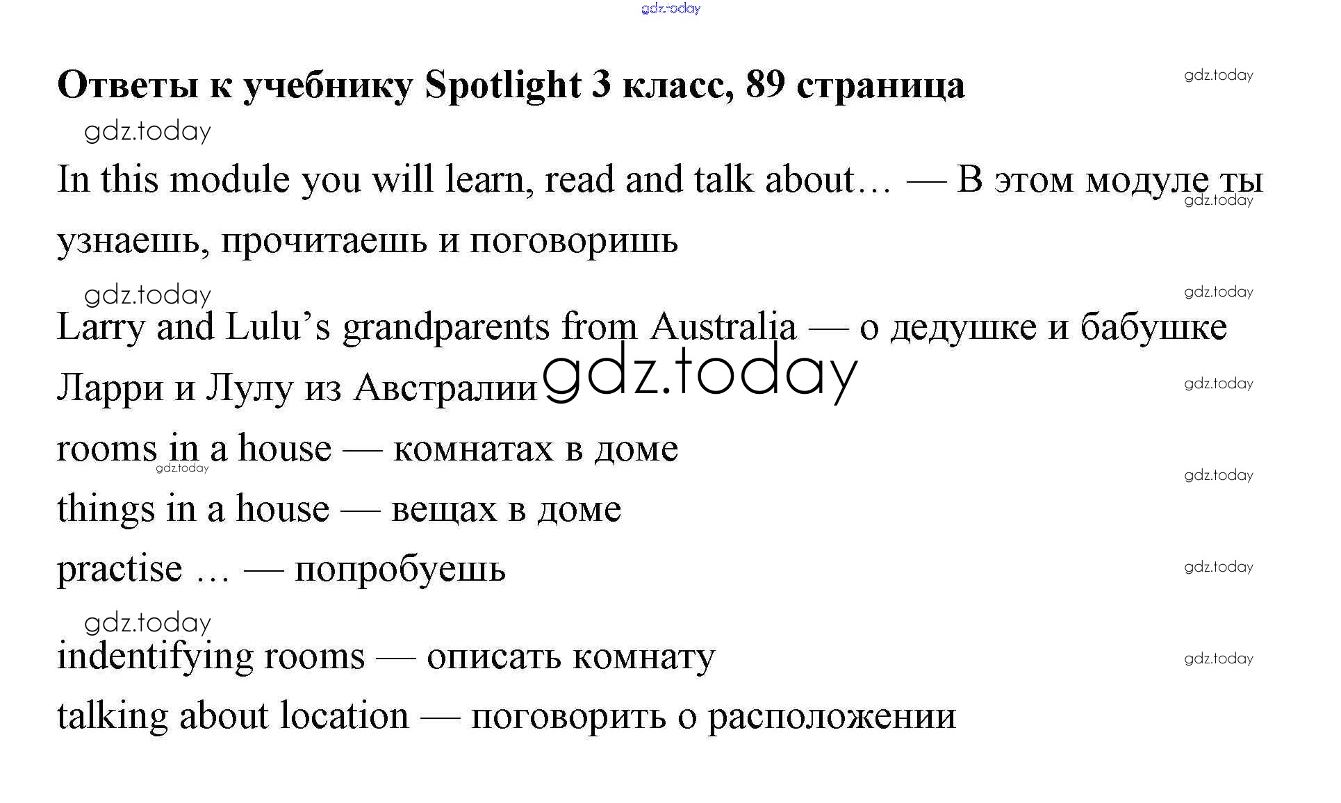 На страницах сайта gdz.today вы найдете учебный и вспомогательный материал, направленный на улучшения знаний школьной программы. ГДЗ - онлайн мир знаний Страницы (решение) 89 Учебнику по Английскому языку для 3 класса Быкова, Эванс Просвещение Spotlight 2015