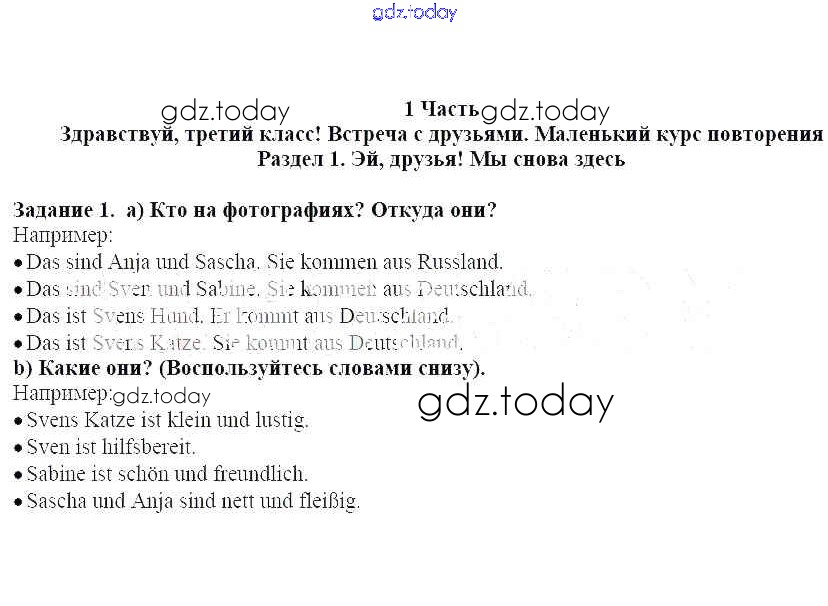 На страницах сайта gdz.today вы найдете учебный и вспомогательный материал, направленный на улучшения знаний школьной программы. ГДЗ - онлайн мир знаний Раздел 1. Эй, друзья! Мы снова здесь Здравствуй, третий класс! Встреча с друзьями. Маленький курс повторения 1 Учебнику по Немецкому языку для 3 класса Бим, Рыжова Просвещение 2014