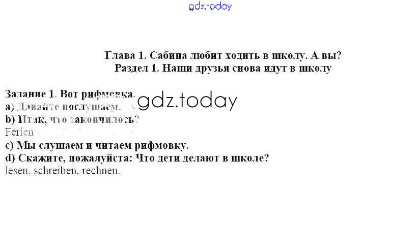 На страницах сайта gdz.today вы найдете учебный и вспомогательный материал, направленный на улучшения знаний школьной программы. ГДЗ - онлайн мир знаний Раздел 1. Наши друзья снова идут в школу Решение к главе 1. Сабина любит ходить в школу. А вы? 1 Учебнику по Немецкому языку для 3 класса Бим, Рыжова Просвещение 2014
