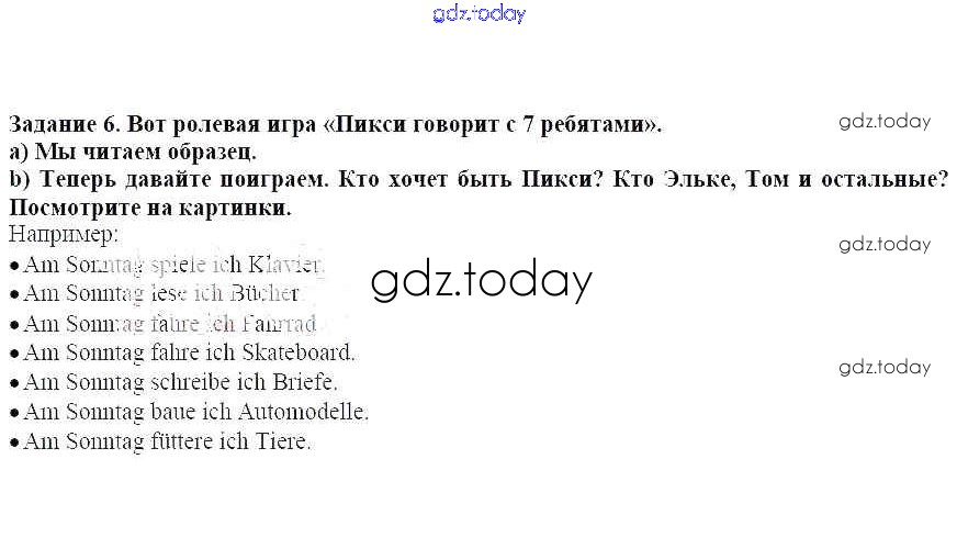 На страницах сайта gdz.today вы найдете учебный и вспомогательный материал, направленный на улучшения знаний школьной программы. ГДЗ - онлайн мир знаний Раздел 4. Какой сегодня день недели Решение к главе 1. Сабина любит ходить в школу. А вы? 6 Учебнику по Немецкому языку для 3 класса Бим, Рыжова Просвещение 2014