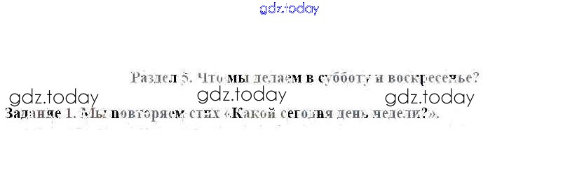 На страницах сайта gdz.today вы найдете учебный и вспомогательный материал, направленный на улучшения знаний школьной программы. ГДЗ - онлайн мир знаний Раздел 5. Что мы делаем в субботу и воскресенье Решение к главе 1. Сабина любит ходить в школу. А вы? 1 Учебнику по Немецкому языку для 3 класса Бим, Рыжова Просвещение 2014