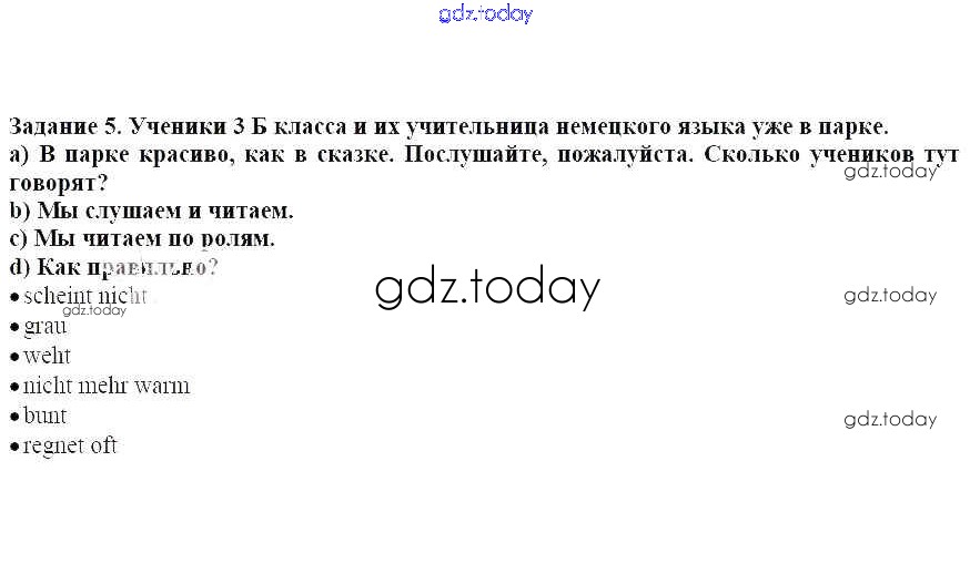 На страницах сайта gdz.today вы найдете учебный и вспомогательный материал, направленный на улучшения знаний школьной программы. ГДЗ - онлайн мир знаний Раздел 1. Прогулка в парке. Как там осенью Решение к главе 2. Осень. Какая сейчас погода 5 Учебнику по Немецкому языку для 3 класса Бим, Рыжова Просвещение 2014