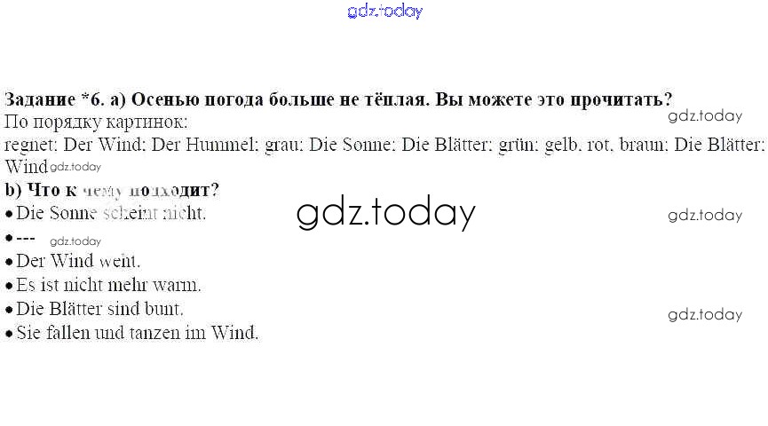 На страницах сайта gdz.today вы найдете учебный и вспомогательный материал, направленный на улучшения знаний школьной программы. ГДЗ - онлайн мир знаний Раздел 1. Прогулка в парке. Как там осенью Решение к главе 2. Осень. Какая сейчас погода 6 Учебнику по Немецкому языку для 3 класса Бим, Рыжова Просвещение 2014