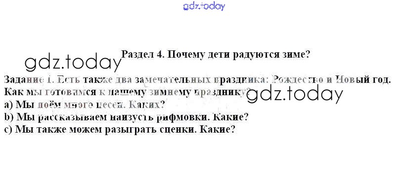 На страницах сайта gdz.today вы найдете учебный и вспомогательный материал, направленный на улучшения знаний школьной программы. ГДЗ - онлайн мир знаний Раздел 4. Почему дети радуются зиме Решение к главе 3. А что приносит нам зима 1 Учебнику по Немецкому языку для 3 класса Бим, Рыжова Просвещение 2014