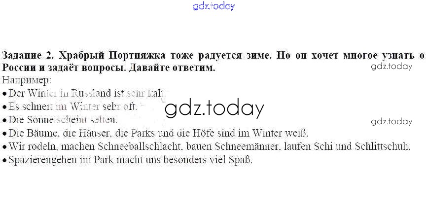 На страницах сайта gdz.today вы найдете учебный и вспомогательный материал, направленный на улучшения знаний школьной программы. ГДЗ - онлайн мир знаний Раздел 6. Мы играем и поём и готовимся к новогоднему празднику Решение к главе 3. А что приносит нам зима 2 Учебнику по Немецкому языку для 3 класса Бим, Рыжова Просвещение 2014