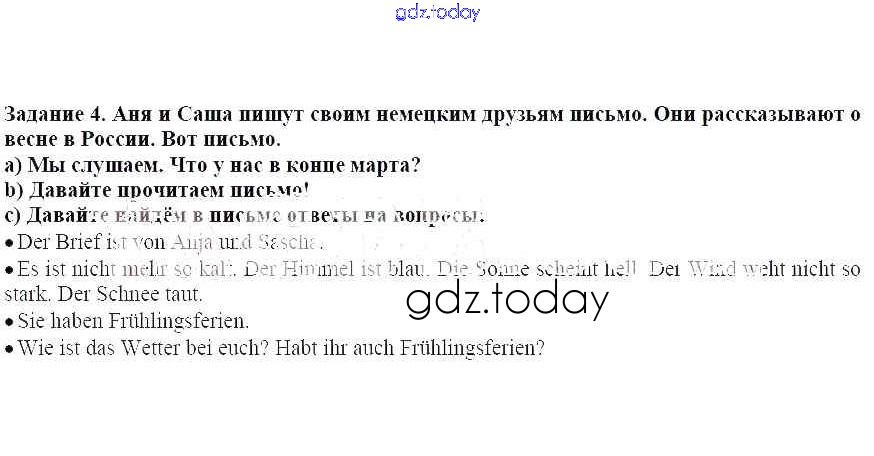На страницах сайта gdz.today вы найдете учебный и вспомогательный материал, направленный на улучшения знаний школьной программы. ГДЗ - онлайн мир знаний Раздел 1. Весна. Какая теперь погода Решение к главе 5. Наступила весна. И с ней замечательные праздника, не так ли 4 Учебнику по Немецкому языку для 3 класса Бим, Рыжова Просвещение 2014