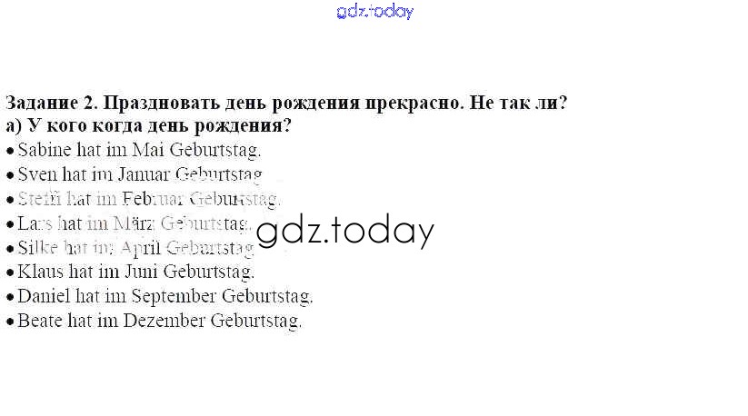 На страницах сайта gdz.today вы найдете учебный и вспомогательный материал, направленный на улучшения знаний школьной программы. ГДЗ - онлайн мир знаний Раздел 2. Сабина пишет приглашения на день рождения Решение к главе 6. День рождения! Это тоже чудесный день, не так ли 2 Учебнику по Немецкому языку для 3 класса Бим, Рыжова Просвещение 2014