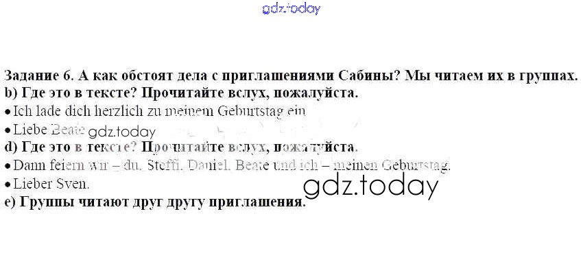 На страницах сайта gdz.today вы найдете учебный и вспомогательный материал, направленный на улучшения знаний школьной программы. ГДЗ - онлайн мир знаний Раздел 2. Сабина пишет приглашения на день рождения Решение к главе 6. День рождения! Это тоже чудесный день, не так ли 6 Учебнику по Немецкому языку для 3 класса Бим, Рыжова Просвещение 2014