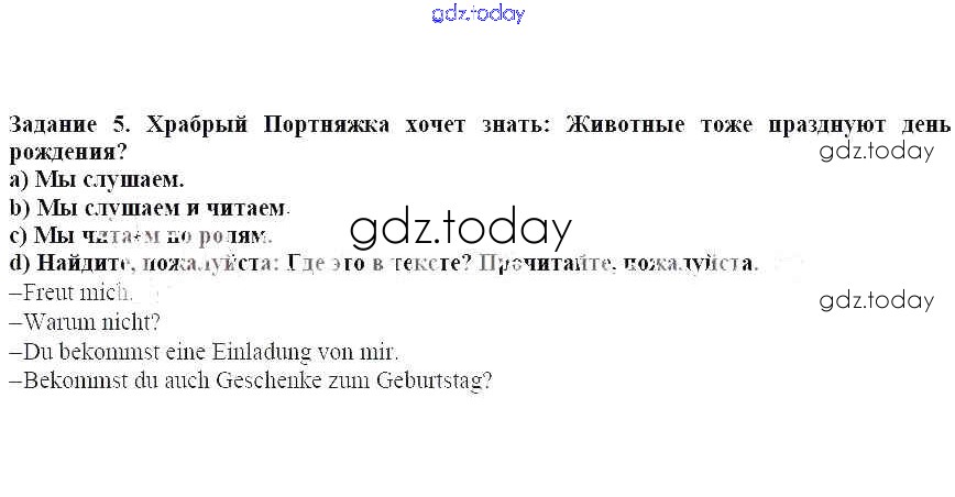 На страницах сайта gdz.today вы найдете учебный и вспомогательный материал, направленный на улучшения знаний школьной программы. ГДЗ - онлайн мир знаний Раздел 4. Подготовка ко дню рождения Решение к главе 6. День рождения! Это тоже чудесный день, не так ли 5 Учебнику по Немецкому языку для 3 класса Бим, Рыжова Просвещение 2014