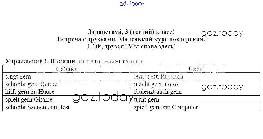 На страницах сайта gdz.today вы найдете учебный и вспомогательный материал, направленный на улучшения знаний школьной программы. ГДЗ - онлайн мир знаний Эй, друзья! Мы снова здесь! Здравствуй, 3 (третий) класс! Встреча с друзьями. Маленький курс повторения 1 Рабочей тетради по Немецкому языку для 3 класса Бим, Рыжова Просвещение 2018