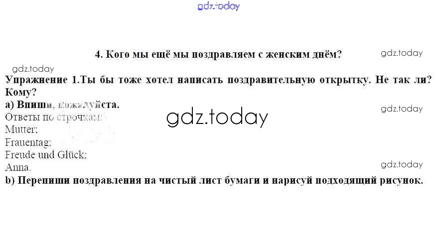 На страницах сайта gdz.today вы найдете учебный и вспомогательный материал, направленный на улучшения знаний школьной программы. ГДЗ - онлайн мир знаний Кого мы ещё мы поздравляем с женским днём Решение к главе V 1 Рабочей тетради по Немецкому языку для 3 класса Бим, Рыжова Просвещение 2018