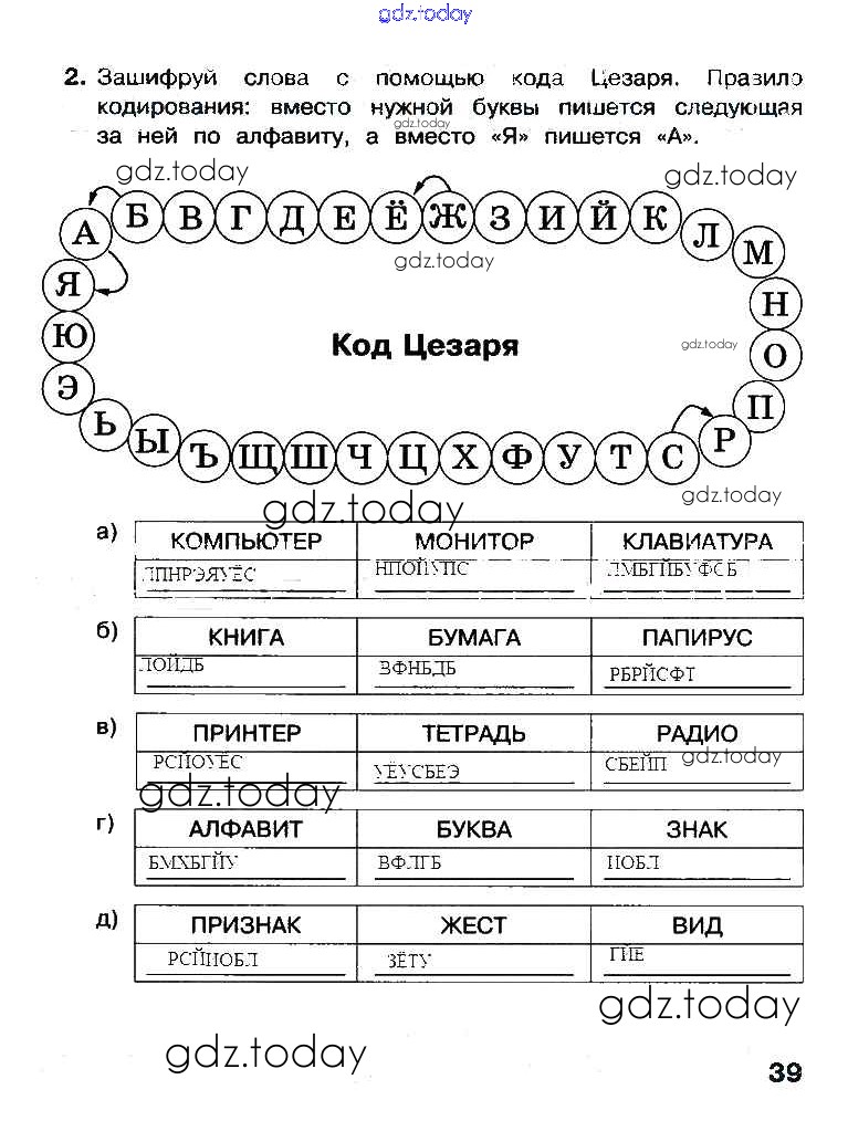 На страницах сайта gdz.today вы найдете учебный и вспомогательный материал, направленный на улучшения знаний школьной программы. ГДЗ - онлайн мир знаний Решение к части 1. Страницы 39 Рабочей тетради по Информатике для 3 класса Матвеева, Челак Бином 2017