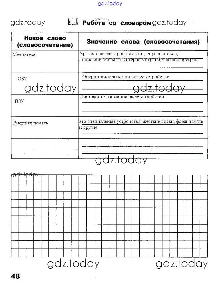 На страницах сайта gdz.today вы найдете учебный и вспомогательный материал, направленный на улучшения знаний школьной программы. ГДЗ - онлайн мир знаний Решение к части 1. Страницы 48 Рабочей тетради по Информатике для 3 класса Матвеева, Челак Бином 2017