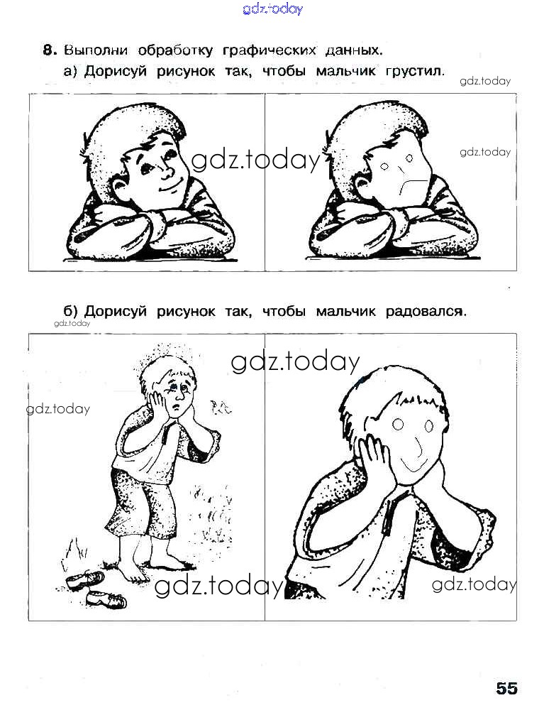 На страницах сайта gdz.today вы найдете учебный и вспомогательный материал, направленный на улучшения знаний школьной программы. ГДЗ - онлайн мир знаний Решение к части 1. Страницы 55 Рабочей тетради по Информатике для 3 класса Матвеева, Челак Бином 2017