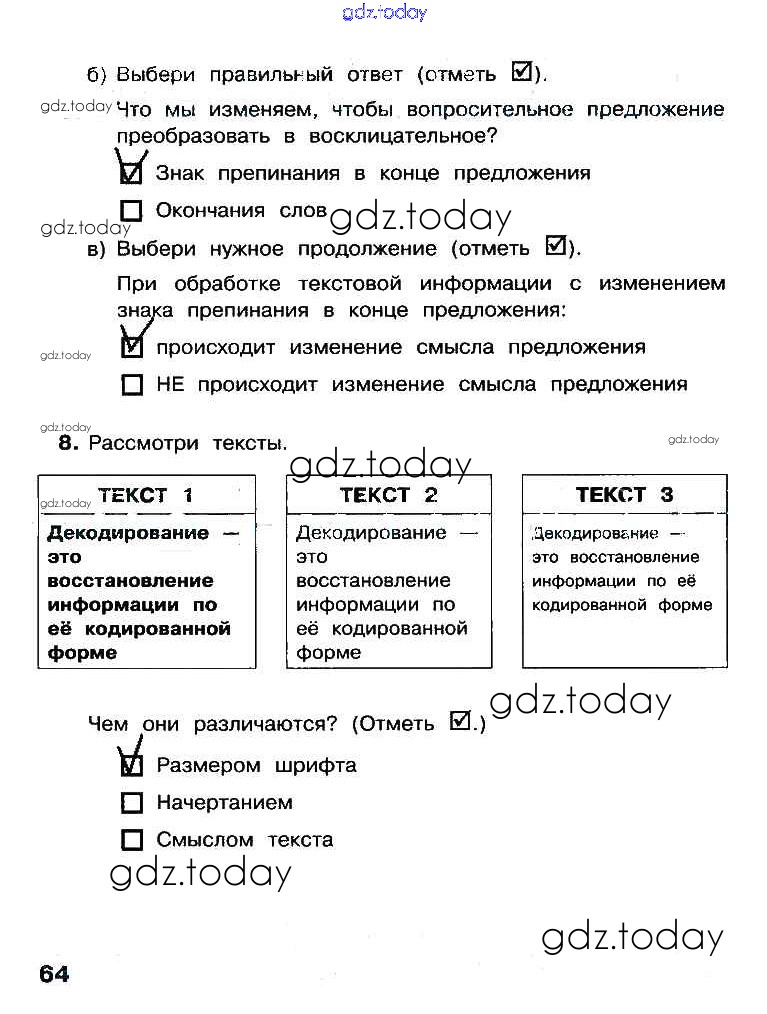 На страницах сайта gdz.today вы найдете учебный и вспомогательный материал, направленный на улучшения знаний школьной программы. ГДЗ - онлайн мир знаний Решение к части 1. Страницы 64 Рабочей тетради по Информатике для 3 класса Матвеева, Челак Бином 2017