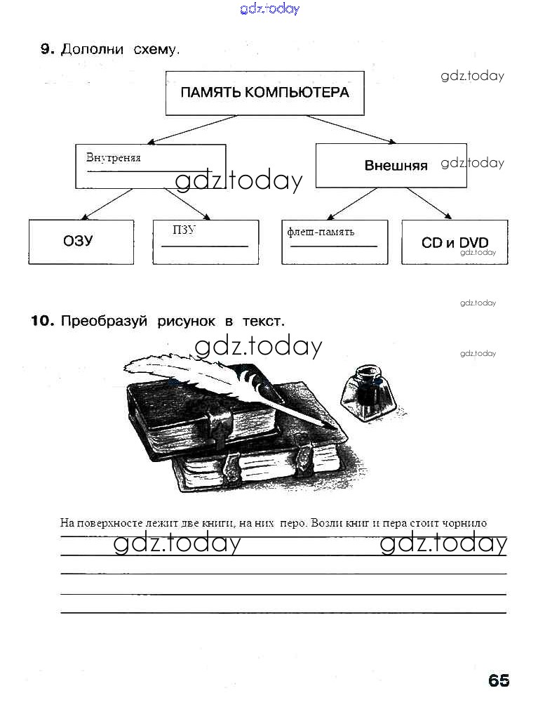 На страницах сайта gdz.today вы найдете учебный и вспомогательный материал, направленный на улучшения знаний школьной программы. ГДЗ - онлайн мир знаний Решение к части 1. Страницы 65 Рабочей тетради по Информатике для 3 класса Матвеева, Челак Бином 2017