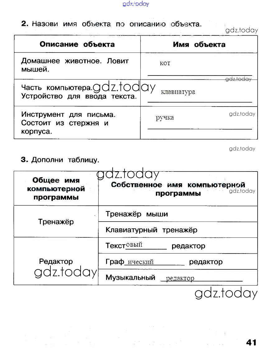 На страницах сайта gdz.today вы найдете учебный и вспомогательный материал, направленный на улучшения знаний школьной программы. ГДЗ - онлайн мир знаний Решение к части 2. Страницы 41 Рабочей тетради по Информатике для 3 класса Матвеева, Челак Бином 2017
